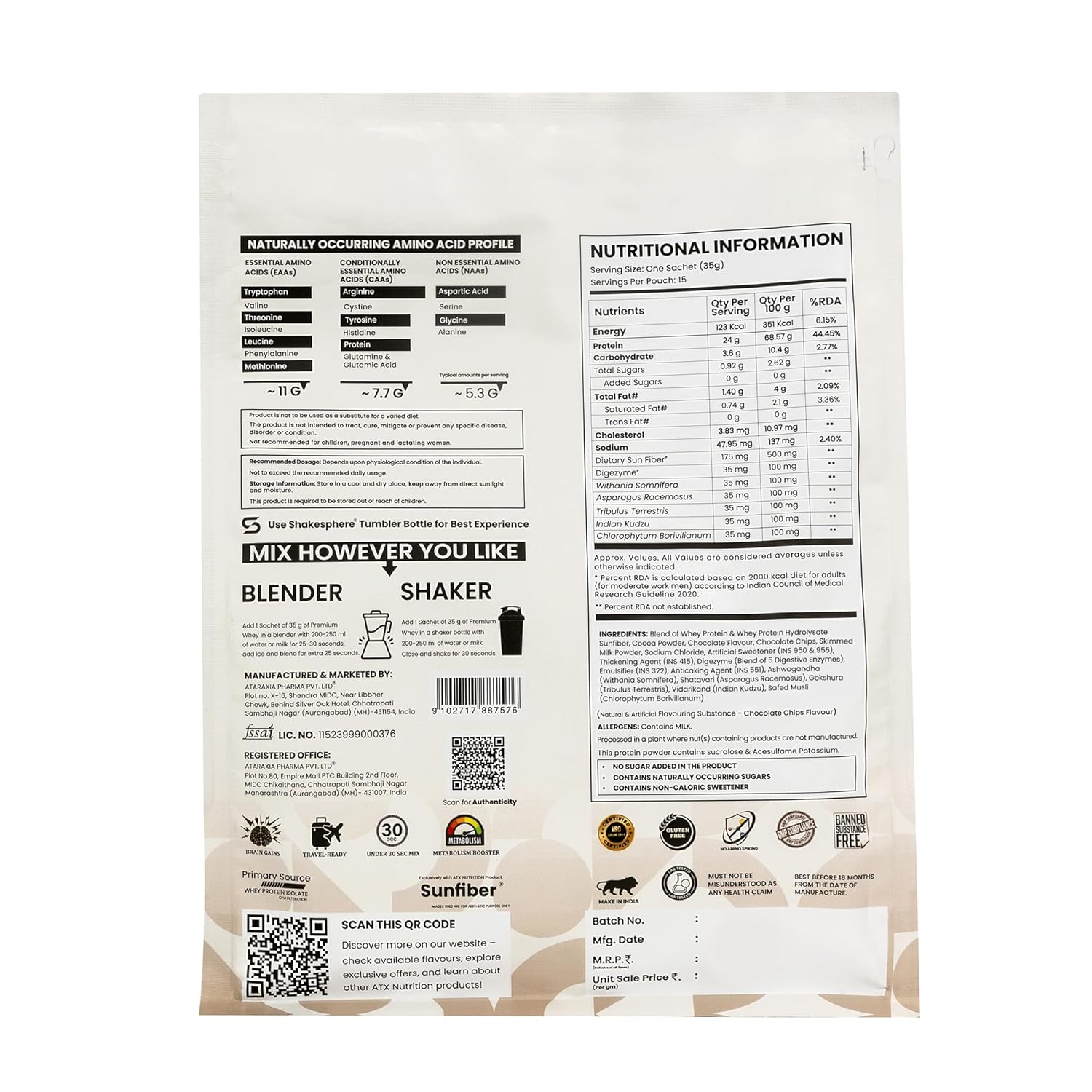Every sachet of ATX Whey – Chocolate Chips blends high-quality Glanbia whey protein with a curated mix of Ayurvedic extracts including Ashwagandha, Shatavari, Gokshura, Indian Kudzu, and Safed Musli. These functional ingredients support muscle repair, hormonal balance, and all-day vitality, making each sip as nourishing as it is delicious.