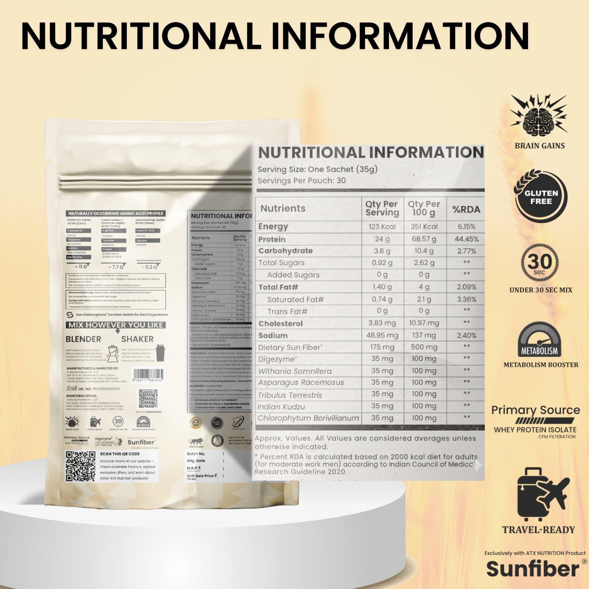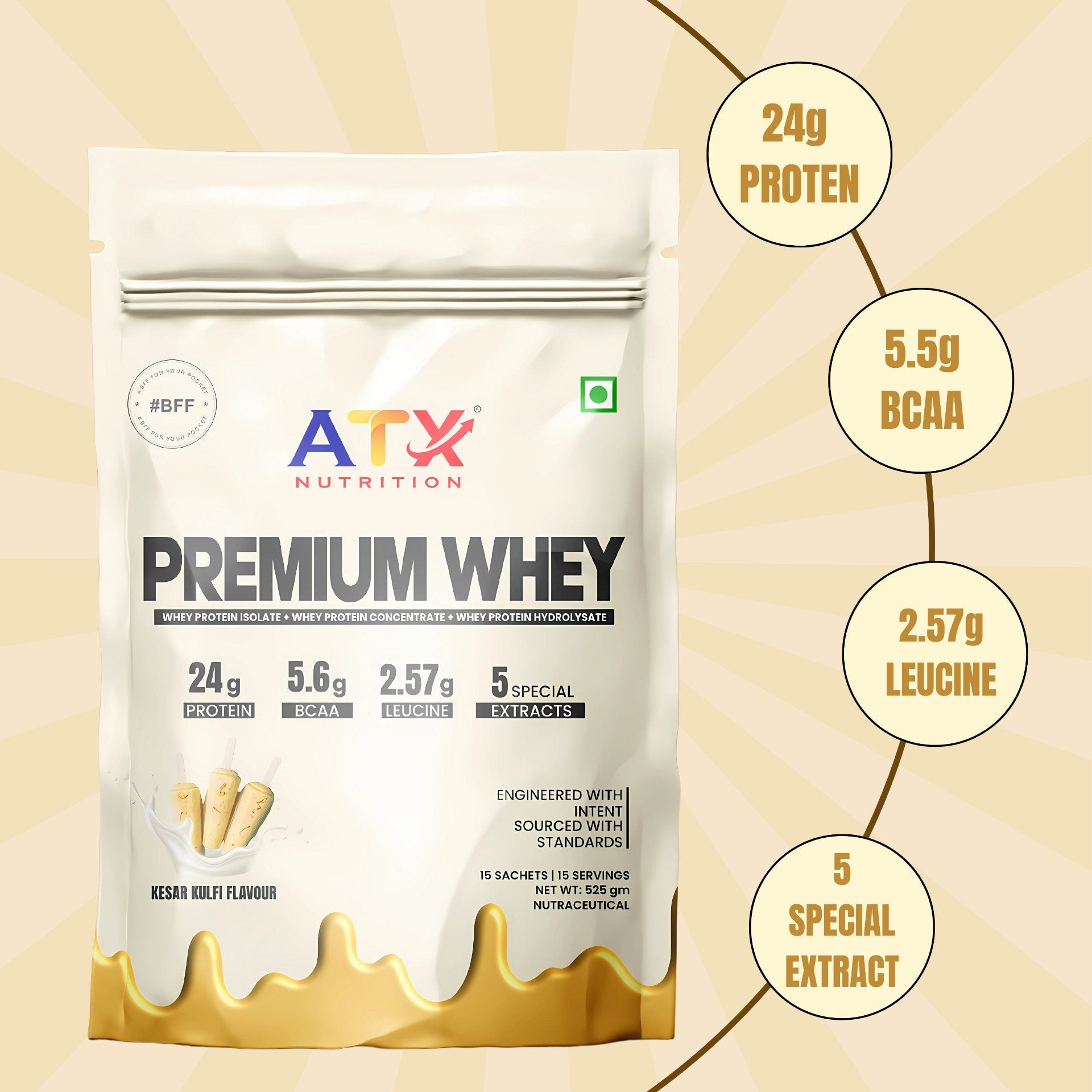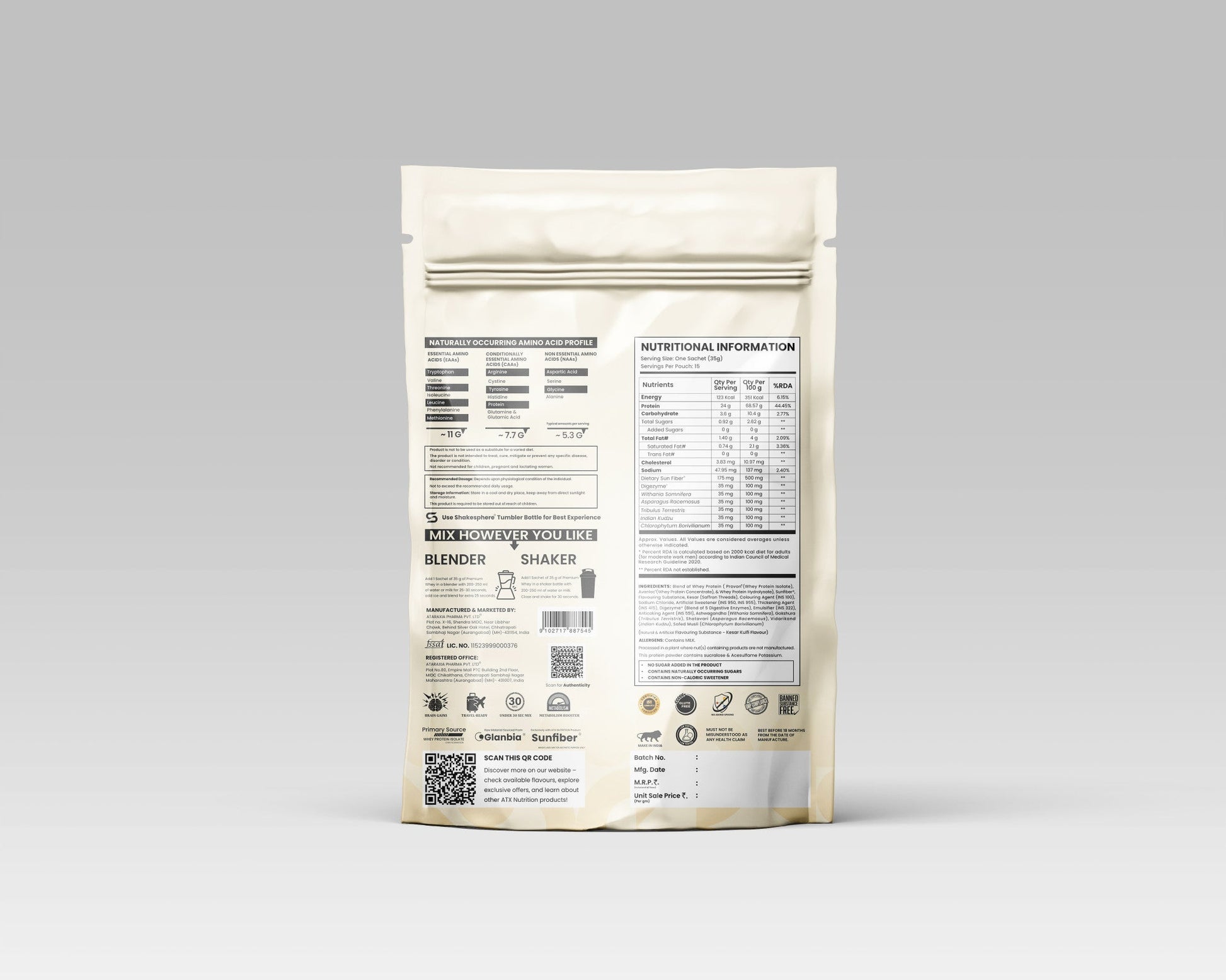Each sachet of ATX Whey – Kesar Kulfi combines Glanbia’s high-quality whey protein with a functional blend of Ayurvedic ingredients like Ashwagandha, Shatavari, Gokshura, Indian Kudzu, and Safed Musli. These powerful extracts are known to support muscle recovery, strength, and vitality, making every serving more than just protein, it’s holistic nourishment designed to complement your fitness and lifestyle goals.